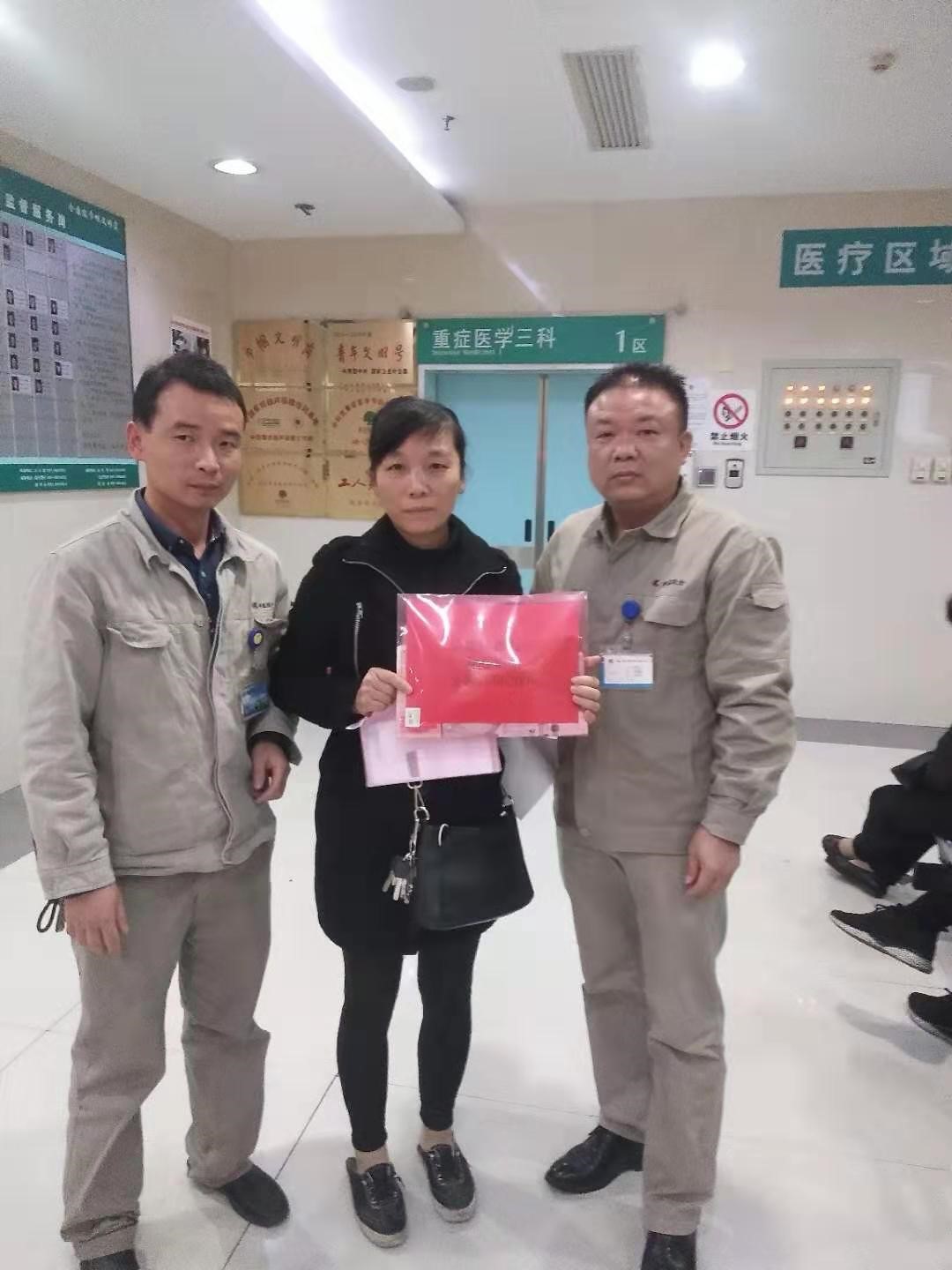 2019年12月5日凌晨,五金公司一车间员工林秀清的儿子(年仅24岁)不幸从家中七楼踩空摔下当场昏迷不醒,经抢救,确诊为少量出血,颅骨骨折,肋骨断裂,大腿骨折。12月5日早上6点其儿子突然心跳加快不能自主呼吸检查后做了开颅手术,经过5个多小时手术,术后住进重症监护室,医生也下达病危通知书。重症监护室每天费用至少1万以上,治疗费用是一个很大的窟窿。股份公公司工会在知道这个情况后,马上从工会困难员工帮扶基金拨付了专项救济金,并向上级工会申请了临时困难救助,同时在公司东台厂区、尚干厂区发起了捐款倡议,为林秀清的孩子捐款,捐款总共募集56200的捐款,悉数送到林秀清的手中,帮助其解了燃眉之急。
